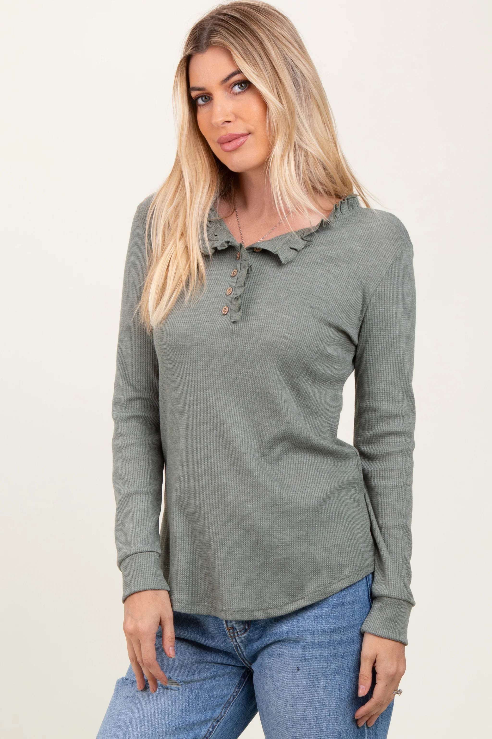 Olive Ruffle Collar Micro Waffle Knit Henley Top