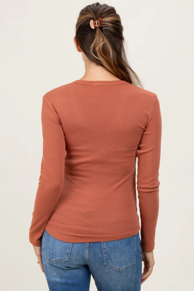 Rust Fine Rib V-Neck Maternity Long Sleeve Top
